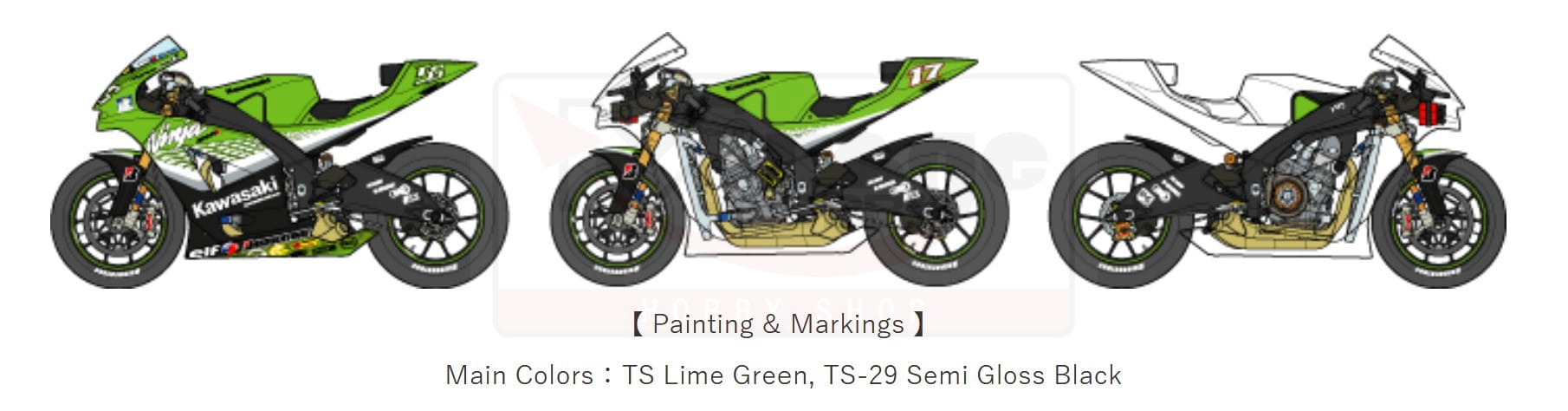 ★Length: 170mm, Width: 61mm ★Accurately-shaped cowlings can be attached/removed using precision screws. ★990cc engine reproduced in great detail. ★Rear suspension secured to frame using nut, and wrench tool is included. ★Synthetic rubber slick tires for added realism. ★High-quality Cartograf decals included for both the No.56 and No.17 machines.