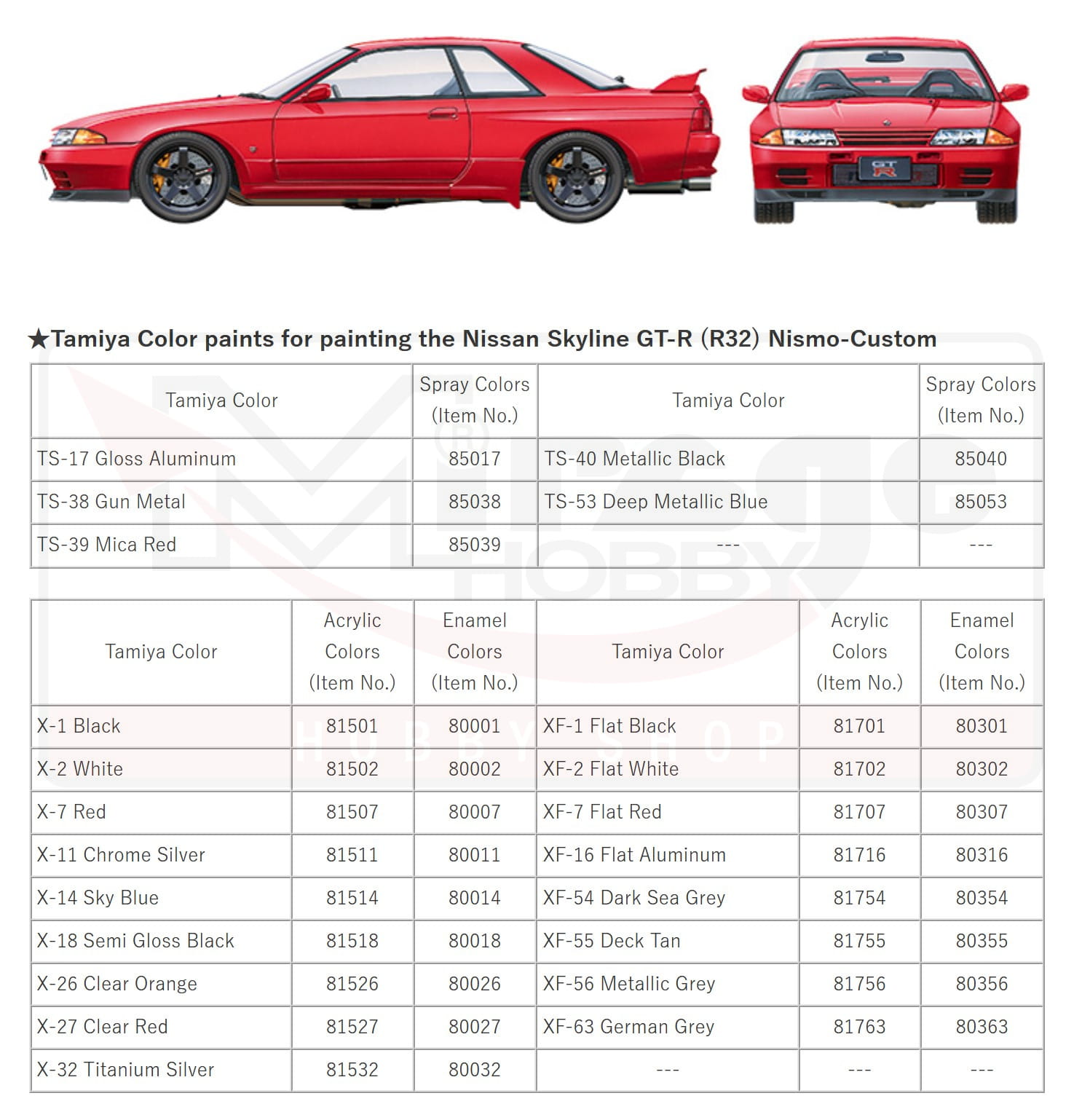 | Take It Up Another Level! This thoroughbred late 1908s monster was developed for competition racing, namely the Group A touring car races that were considered the pinnacle of their era. As such, the Skyline GT-R (R32) was fitted with a powerhouse 2,568cc inline-six DOHC, 24-valve, twin turbocharged and intercooled 280hp engine. It was loaded with cutting edge technology such as Nissan's original ATTESA E-TS variable torque-split 4-wheel drive train, and a SUPER HICAS 4-wheel steering system. For those who wanted to take its performance (and looks) to even greater heights, there was also a healthy market for customizing parts; principal among the suppliers were Nismo, Nissan's racing arm. This precision plastic model recreates a customized Skyline GT-R (R32) fitted with a bevy of after-market parts including Nismo offerings. |
