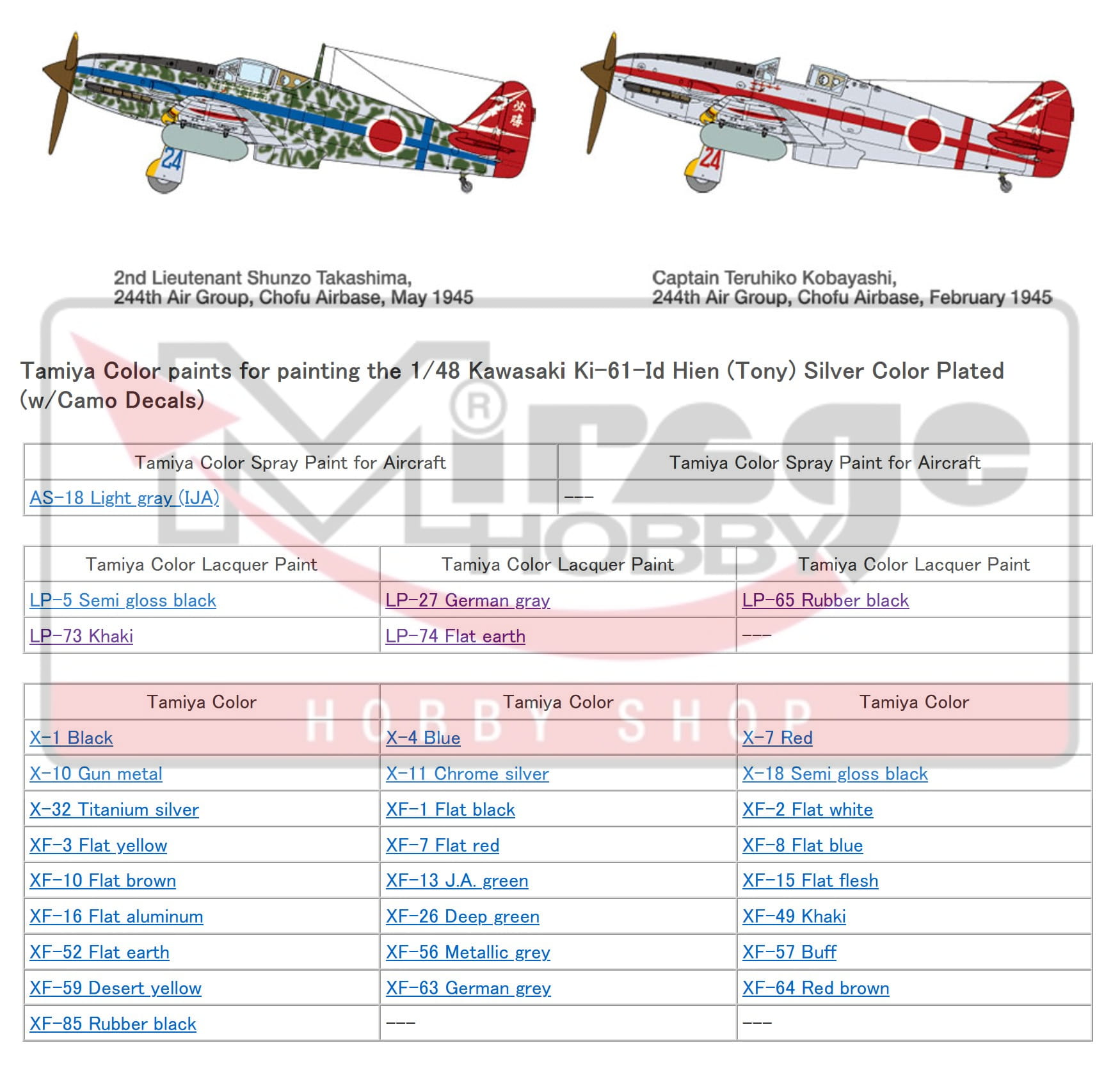 TAMIYA 25424 1:48 Kawasaki Ki-61-Id Hien (Tony) Silver Color Plated (w/Camo Decals)