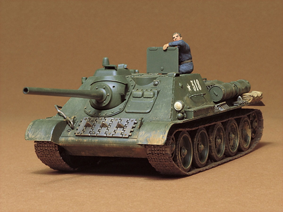 Jest to model zestawu kultowego rosyjskiego czołgu SU-85, pierwotnie wydanego w 1975 roku. Prawdziwy przedmiot został wprowadzony w bitwie pod Kurskiem w 1943 roku. Pojawił się nowo zaprojektowany SU-85 oparty na udanym SU-122 uzbrojony w D-5S-85A, działo przeciwlotnicze z 1939 r. kalibru 51,5 kalibru 85 mm 85 mm, które zostało przeprojektowane do użytku przeciwpancernego. Działa D-5 zostały opracowane w taki sam sposób jak niemieckie działa przeciwpancerne 88 mm wyposażone w niemieckie czołgi Tiger I i Jagdpanther, ponieważ oba działa oparte były na działach przeciwlotniczych. Pocisk przeciwpancerny SU-85 ważył 9,02 kg, miał prędkość 792 m / s i mógł wybijać czołgi ze zbroją o grubości 100 mm na 1000 m. Kadłub SU-85 miał pochylony przedni pancerz, a przedział bojowy był przesunięty w prawo. Po wyzwoleniu Kijowa w grudniu 1943 r. SU-85 zmierzył się z czołgami Panther i Jagdtiger i utrzymał swój własny dzięki działowi 85 mm. Ostry styl SU-85 z długim pistoletem jest teraz odtwarzany jako model w skali 1/35. Ten zestaw został wydany po raz pierwszy w 1975 roku.
