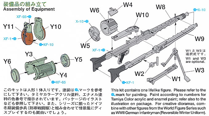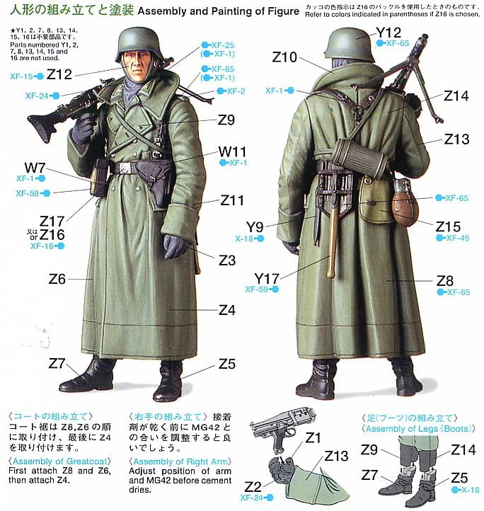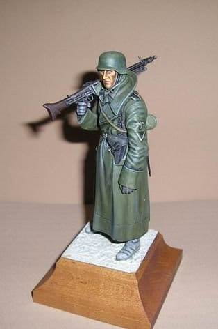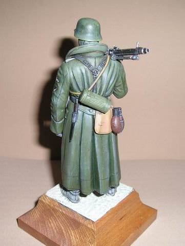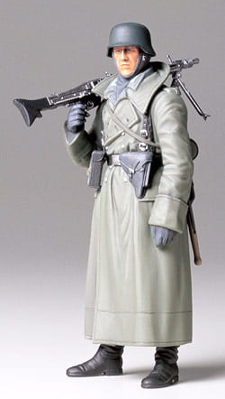 Plastikowy model do sklejania dla niemieckiego strzelca maszynowego podczas II wojny światowej. Ubrany w płaszcz z późnego modelu, z dużym realizmem wymodelowany na ramieniu karabin maszynowy MG42. Płaszcz jest podzielony na trzy części u dołu, a obszar kołnierza jest również umieszczony jako osobna część, co nadaje mu trójwymiarowe wykończenie.