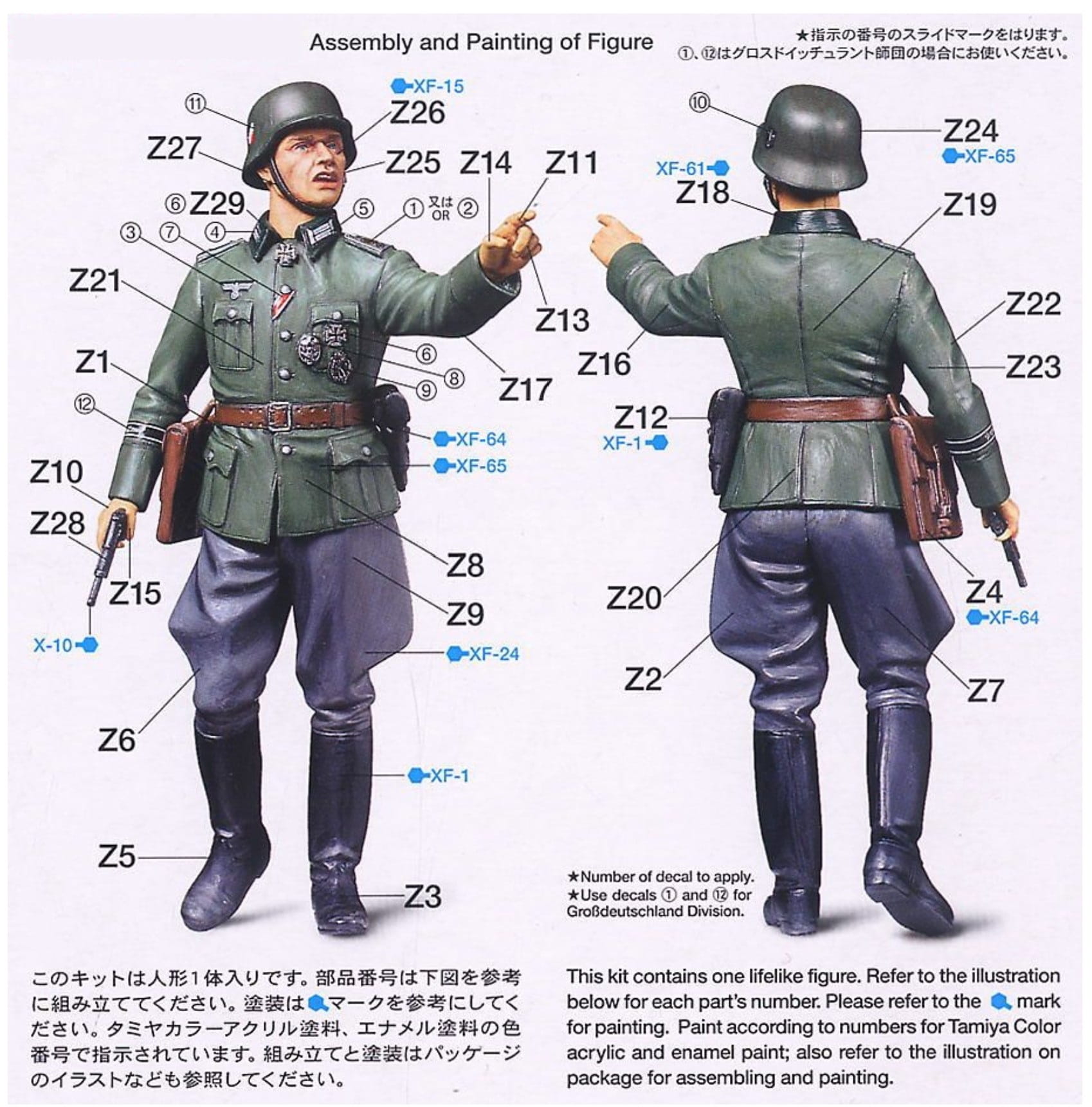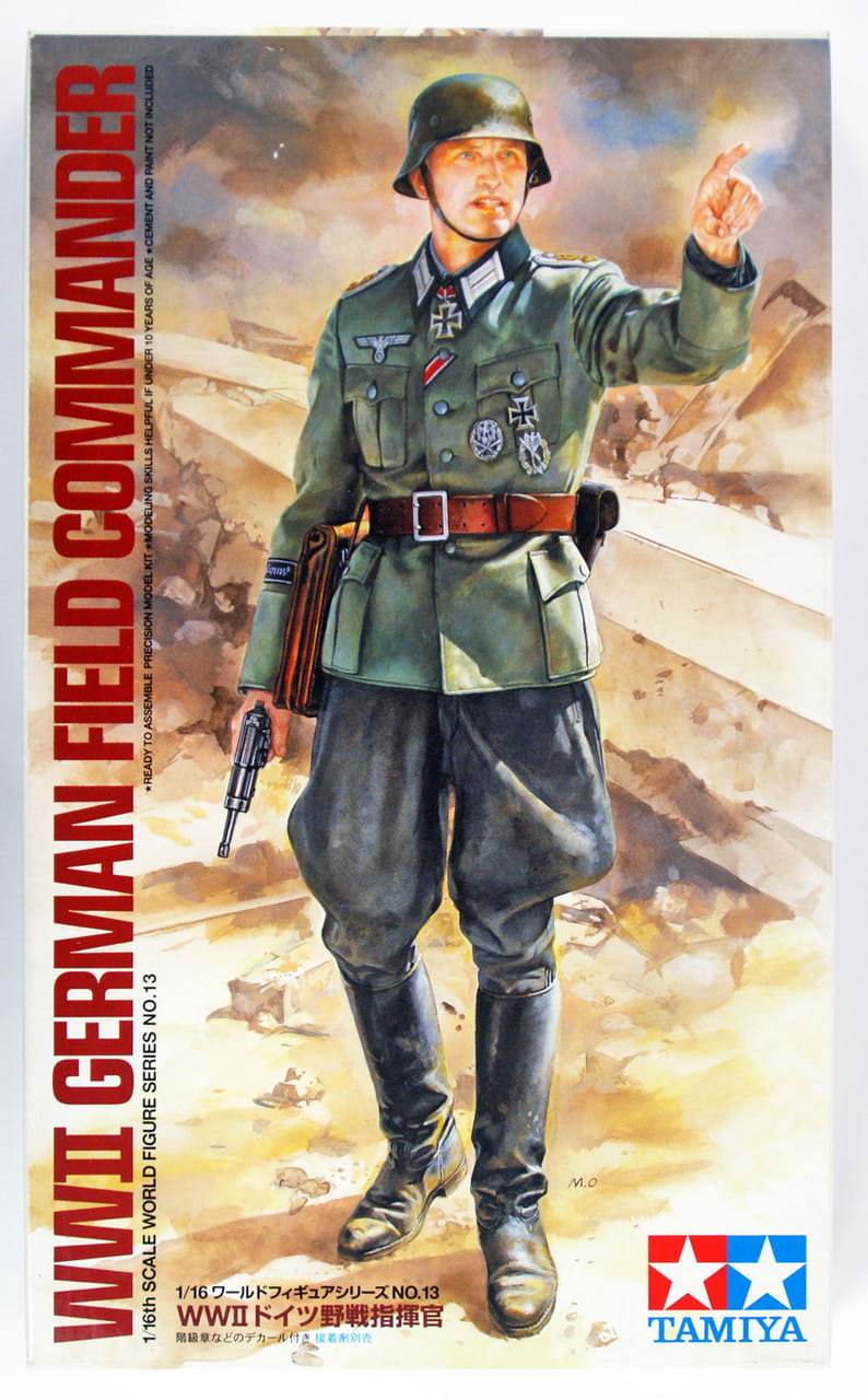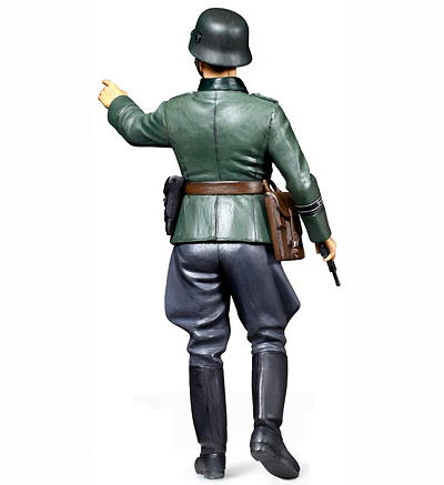 Model plastikowy niemieckiego dowódcy polowego z czasów II wojny światowej. Pistolet, kieszeń boczna, kołnierz i inne części formowane oddzielnie. Zawiera kalkomanie do insygniów i emblematów jednolitej rangi.