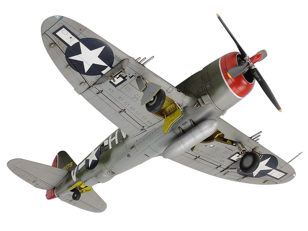 The P-47 was the first single-seated fighter to be equipped with a supercharger paired with a 2000hp engine, allowing it to fly at the same high altitude as bombers. Armed with eight 12.7mm machineguns, the Thunderbolt, with the P-51 Mustang, constituted the main fighters of the US Army Air Force. This is the representation of P-47D early production that was nicknamed "razorback" because of the shape of its upper fuselage behind the cockpit. The P-47D was a high-speed, high-altitude capable fighter and escorted the allied bombers that were conducting raids over Germany. Its 1-ton payload and robustness made the Thunderbolt the perfect aircraft for ground attacking missions.