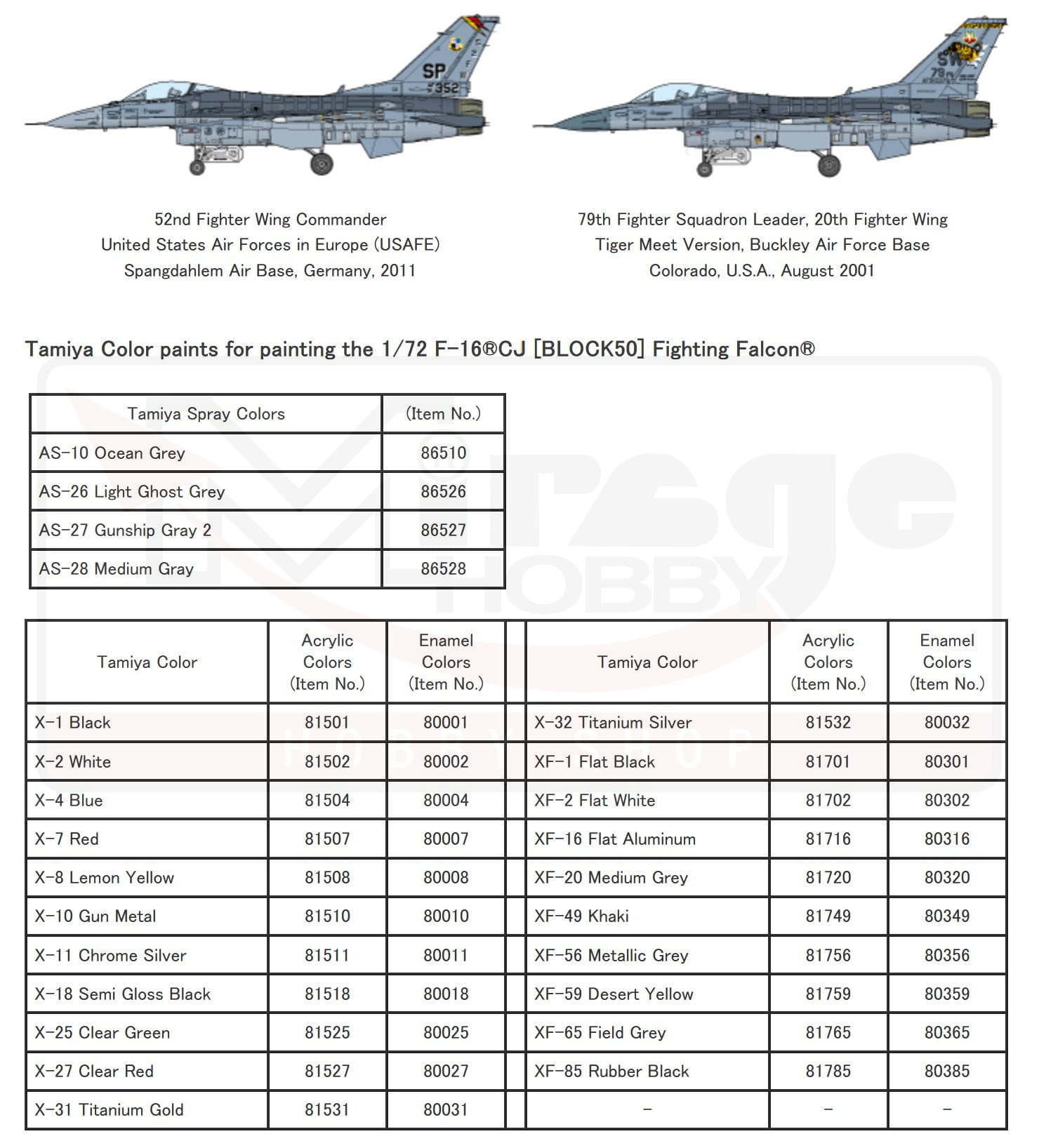 1/72 scale plastic assemnbly kit of the F-16CJ [Block 50] ★Length: 213mm, Wingspan: 141mm ★Aerodynamic form of the aircraft has been accurately reproduced. ★The model's sharp finish is showcased on parts such as the air intake lip and wing leading edges. ★Hassle-free assembly meets Tamiya's trademark attention to detail. ★Faithfully recreated IFF antenna at the front of the cockpit. ★Choose to depict bubble canopy in open or closed position. ★AIM-120C and AIM-9M air-to-air missile parts are included. ★Cockpit interior and main landing gear bay are also faithfully recreated. ★Comes with a seated pilot figure and 3 kinds of marking options.