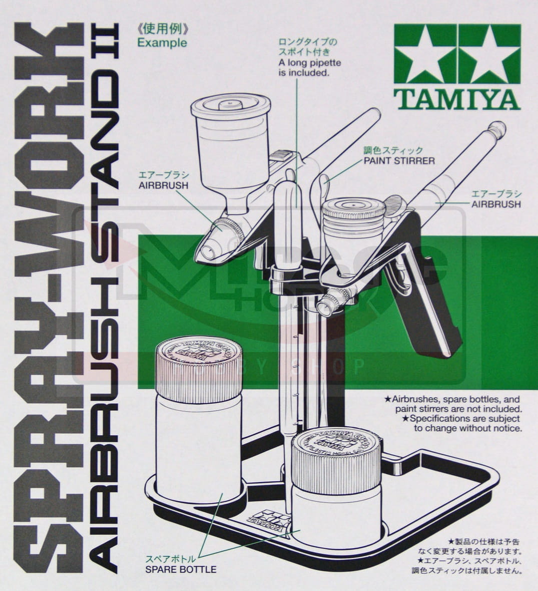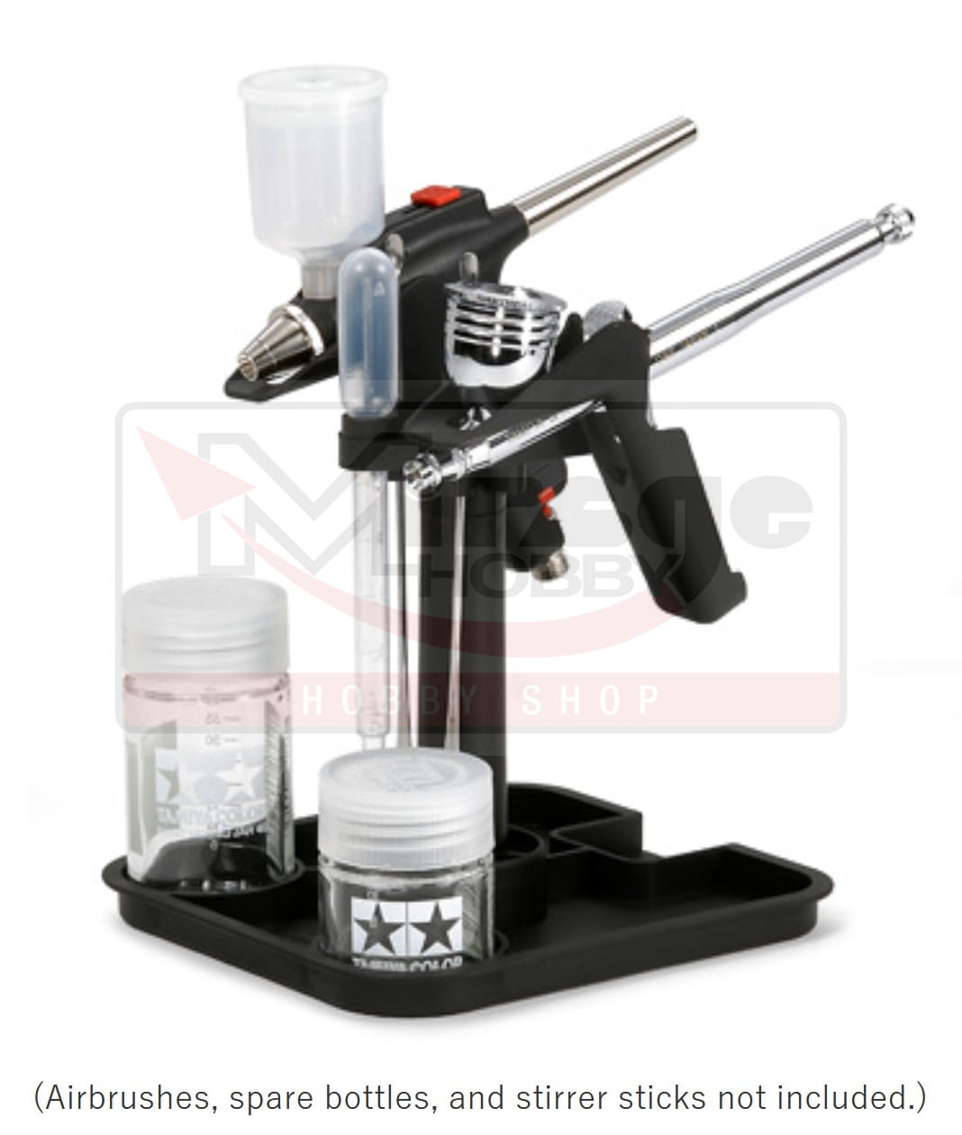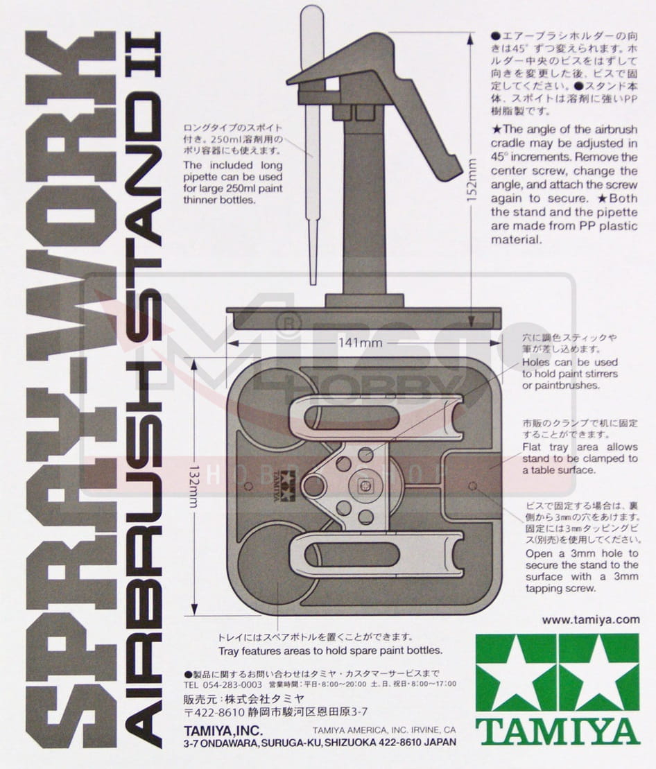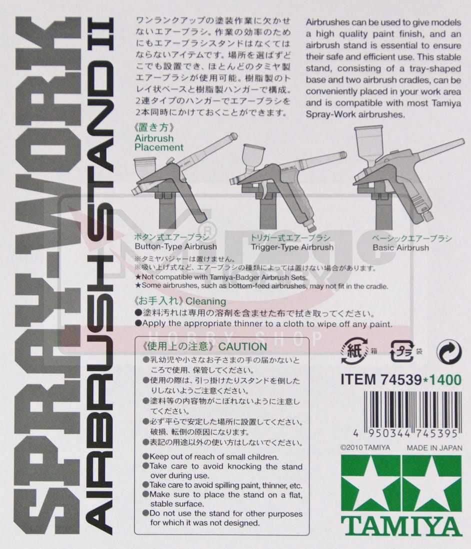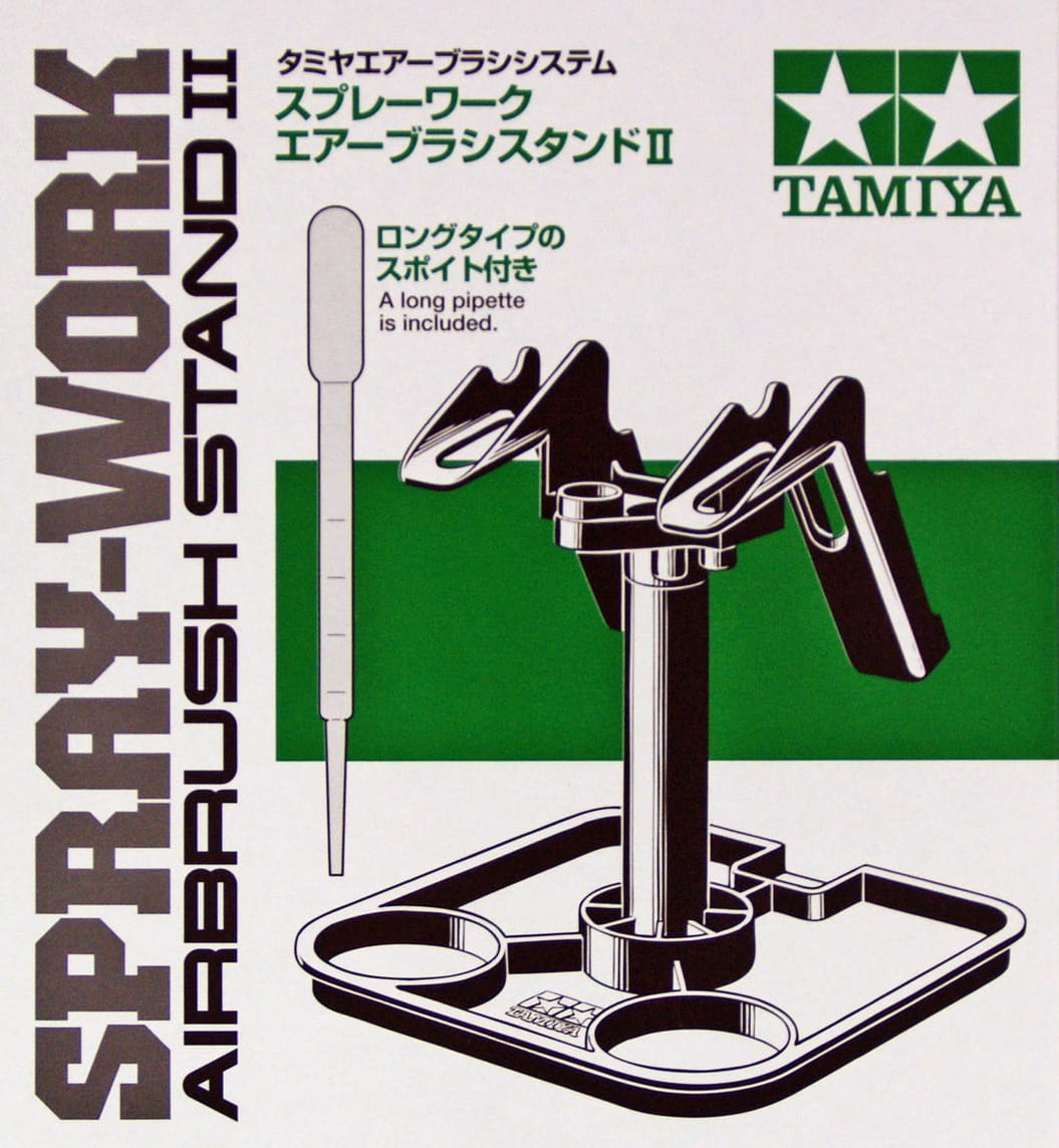 Stojak ten składa się z podstawy w kształcie tacy oraz dwóch wieszaków na aerografy, które umożliwiają umieszczenie dwóch aerografów jednocześnie i jest kompatybilny ze wszystkimi aerografami Tamiya z wyjątkiem aerografów Tamiya Badger. Dodatkowo na podstawie można umieścić zapasowe butelki, a do podpórki przymocować mieszadła. W zestawie długa pipeta.