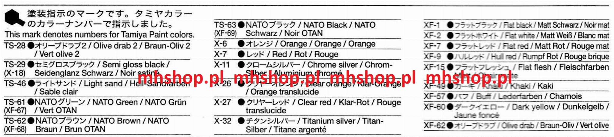 Malowanie:TS-28,TS-29,TS-46,TS-61,TS-62,TS-63,X-11,X-18,X-26,X-27,X-32,X-6,X-7,XF-1,XF-15,XF-2,XF-49,XF-57,XF-60,XF-62,XF-67,XF-68,XF-69,XF-7,XF-9,