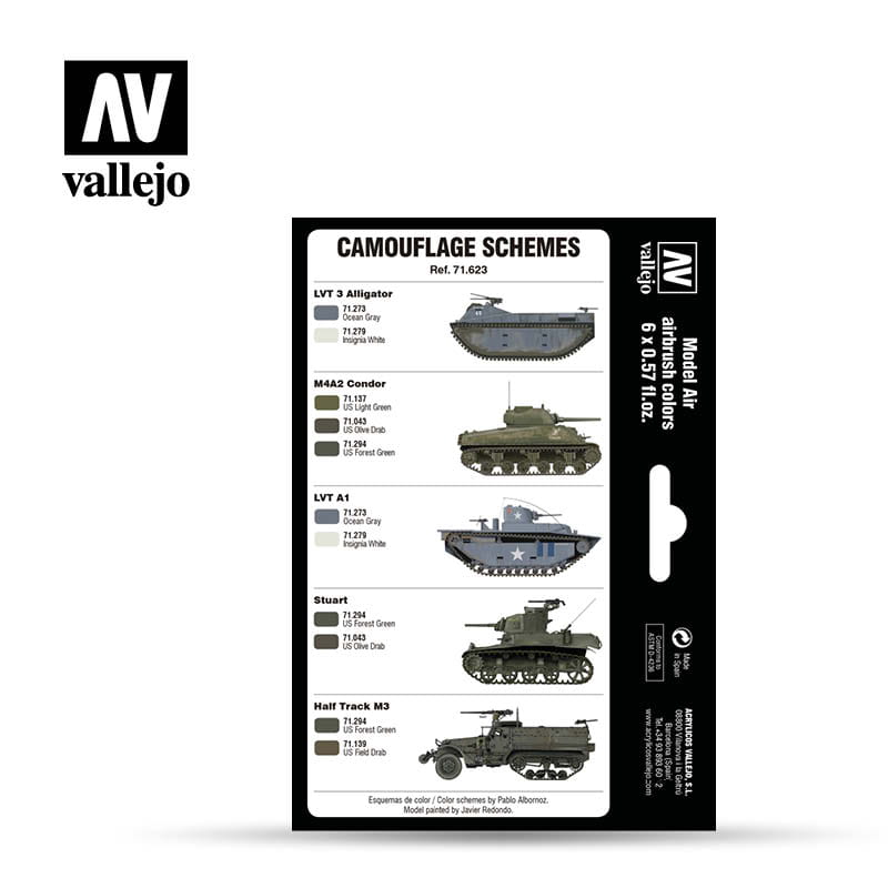 Zestaw zawiera wszystkie odcienie używane do przedstawiania różnych schematów kamuflażu używanych przez USMC na swoich pojazdach, a także referencyjny Ocean Grey, używany w jednostkach AMTRAC operujących w Saipan lub Tarawa, a także w innych lądowiskach bojowych.