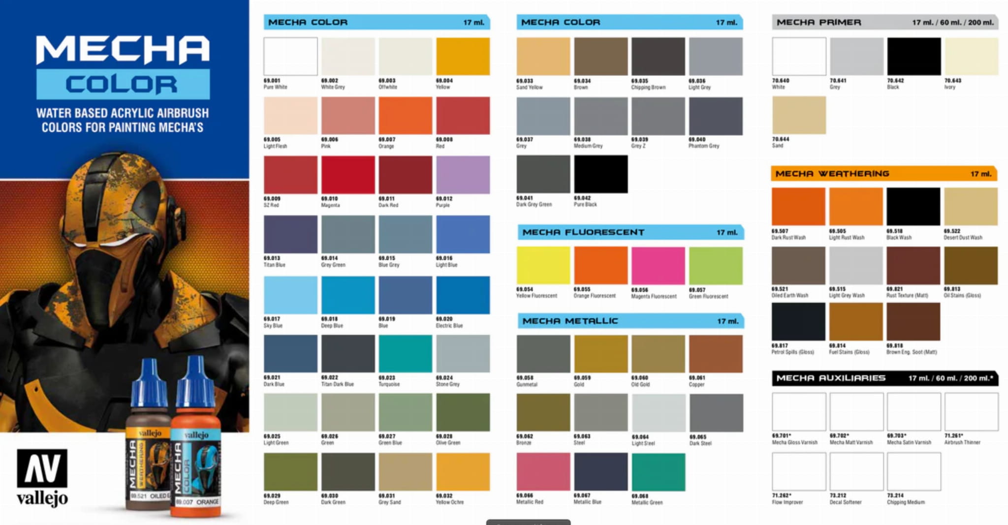 Mecha Color może być bezpośrednio lakierowany lub rozcieńczany za pomocą Vallejo Airbrush Thinner lub Flow Improver, a kolory można również nakładać pędzlem. Zalecana regulacja kompresora wynosi 15-20 PSI o 0,5 do 1 kg. Aby uzyskać najlepszą konserwację aerografu, zalecamy użycie Vallejo Airbrush Cleaner.