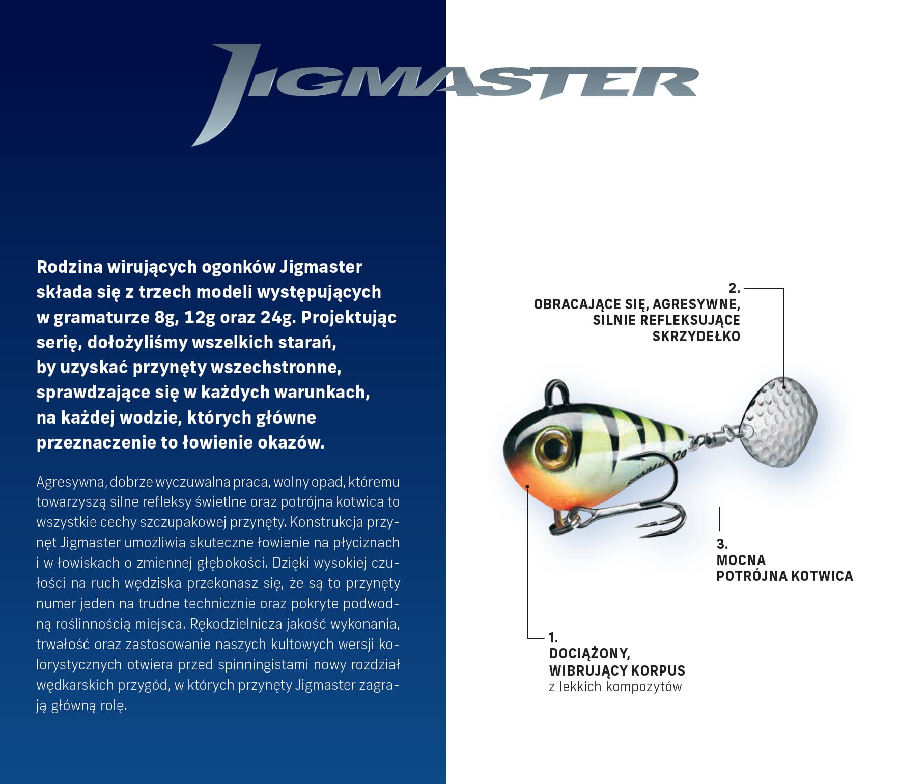 Agresywna, dobrze wyczuwalna praca, wolny opad, któremu towarzyszą silne refleksy świetlne oraz potrójna kotwica to wszystkie cechy szczupakowej przynęty. Konstrukcja przynęt Jigmaster umożliwia skuteczne łowienie na płyciznach i w łowiskach o zmiennej głębokości.
