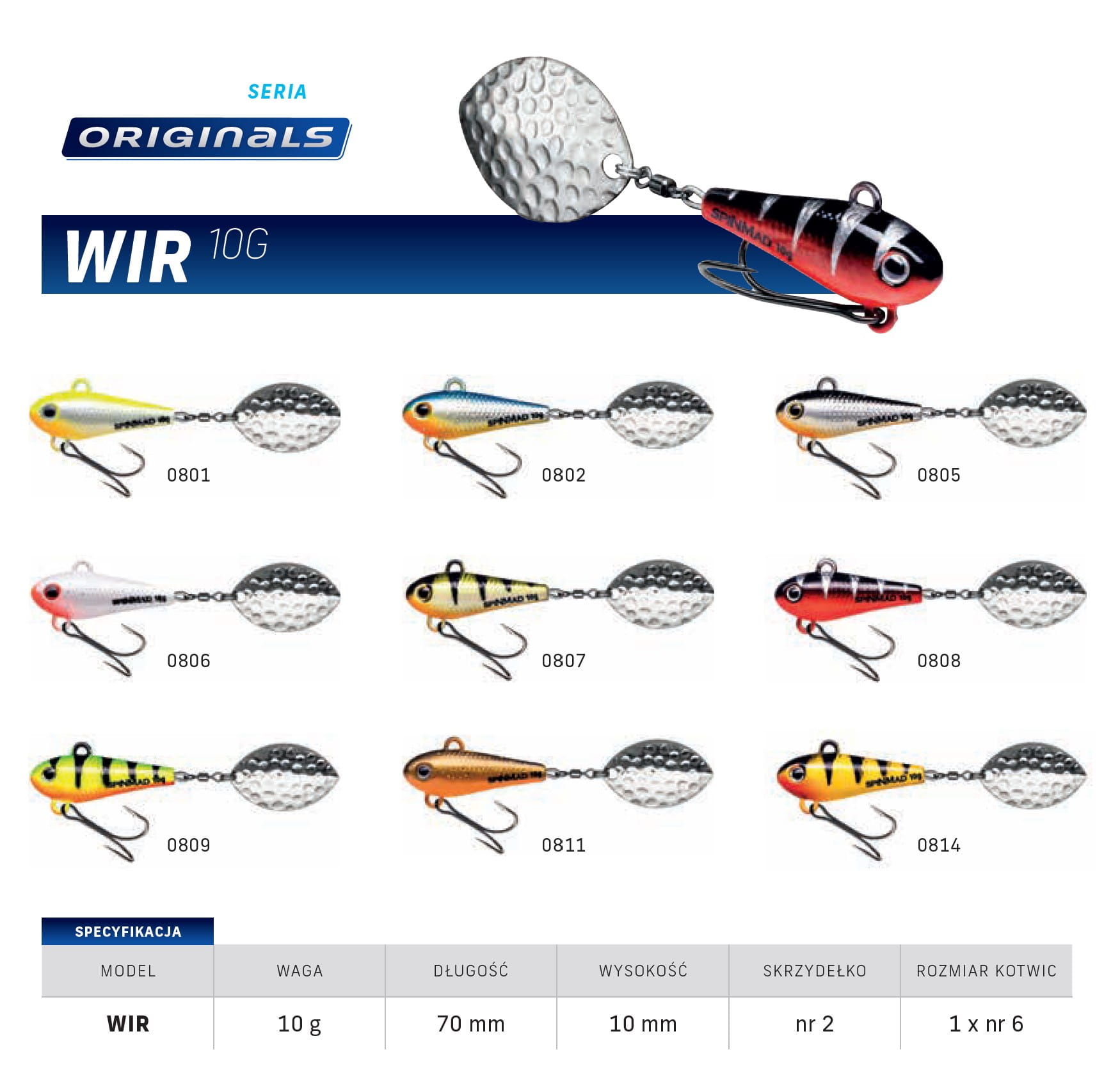 Każdy spinningista powinien mieć w pudełku przynętę, która jest uniwersalna. Wir bez wątpienia do takich należy. 10 gramowa przynęta mimo stosunkowo zwartej budowy będzie doskonała nie tylko na grube okonie i klenie, ale także na szczupaki i sandacze z głębszych partii wody. Główną zaletą tej przynęty jest doskonale pracujący ogonek, który praktycznie nigdy się nie zatrzymuje. To jak go poprowadzimy zależy tylko od nas. Leniwe jednostajne zwijanie w okolicy dna, agresywne podszarpywanie czy łowienie techniką opadu, we wszystkich sposobach prowadzenia Wir sprawdzi się doskonale. Wir jak większość przynęt SpinMad występuje w bogatej gamie kolorystycznej, co pozwoli dobrać odpowiedni kolor na różne rodzaje łowisk. Dopełnieniem całości są niezawodne kotwice.