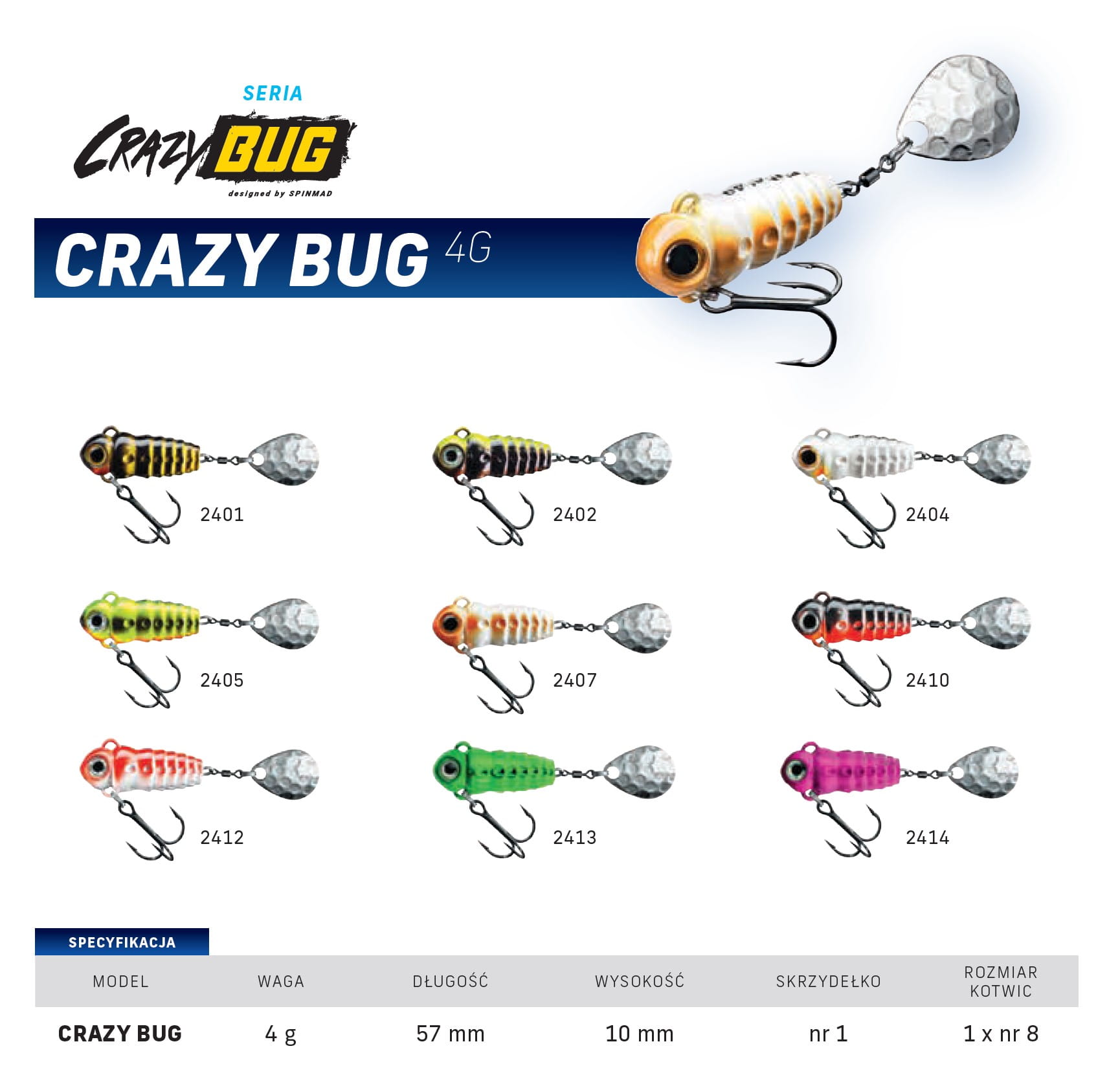 Nie od dzisiaj wiadomo, że nie ma lepszego miejsca na czerpanie inspiracji do tworzenia przynęt niż otaczająca nas przyroda. Obcowanie z nią i próba jej zrozumienia pozwala wyciągnąć to co najlepsze, a w efekcie przełożyć to na skuteczniejsze łowienie ryb. Chcąc zbliżyć się do natury, projektanci SpinMad przygotowali serię przynęt CRAZY BUG. Korpus tych przynęt wiernie imituje wszędobylskie robaki, larwy owadów czy chrząszczy. To właśnie te owady są bardzo częstym pokarmem wielu gatunków ryb jak pstrągi, klenie czy jazie. Zostały one zaprojektowane z myślą o łowieniu w płytkich łowiskach w powierzchniowej strefie wody oraz toni wodnej.