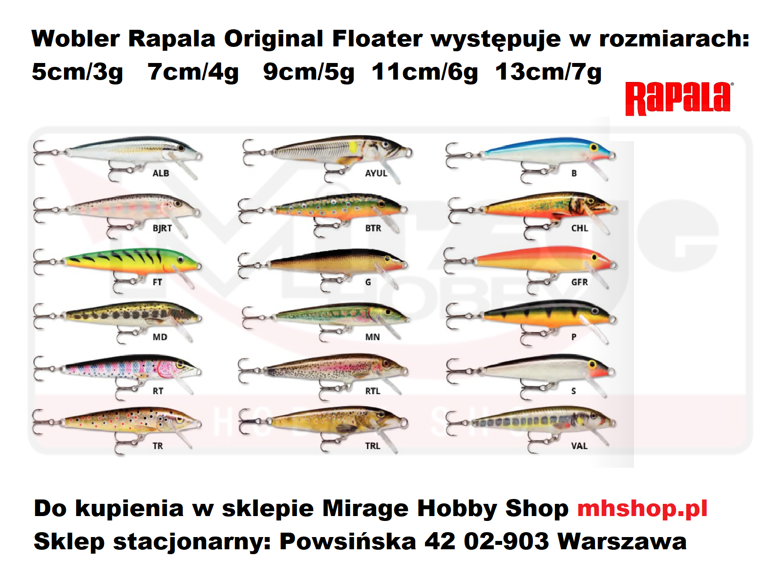 Woblery Rapala Original Floater są wykonane z balsy. Jest to przynęta wyjątkowo wszechstronna i do stosowania w niemal każdych warunkach. Charakteryzuje się tym, że jest ręcznie dostrajana przez testerów Rapala, przez co jest niezwykle skuteczna bez względu na głębokość.